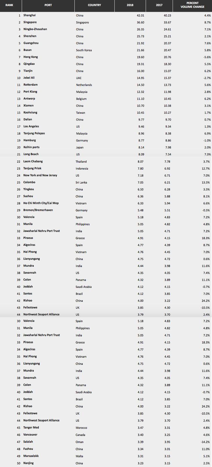 El Puerto de Shanghái mantuvo su primer lugar en la lista, reportando un aumento de 4.4% en el volumen de contenedores a poco más de 42 millones de TEUs, más de cuatro veces a los 9,5 millones de TEUs manejados por el puerto más concurrido de América del Norte, Los Ángeles. Entrando en el No. 2, el Puerto de Singapur reportó la tasa de crecimiento más alta de cualquier puerto en el top 20, aumentando su rendimiento en un 8.7% a 36.6 millones de TEUs para el año.
